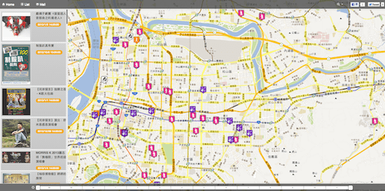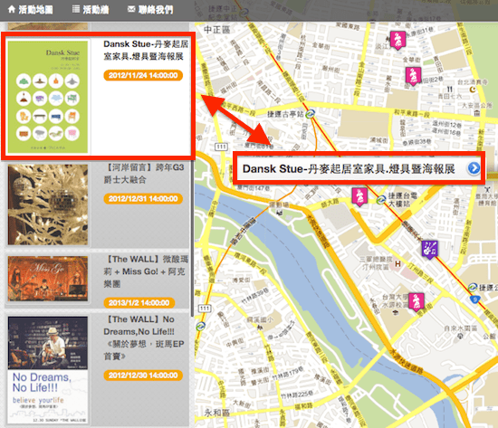 在網頁左邊會列出地圖上的活動列表,列表上的每個項目,代表會在地圖上顯示的活動地標,每個項目會包含活動的縮圖、主題、時間,這邊有個方便的功能就是,當你點選活動列表的項目時,會把選擇的活動地點,動態的移動到地圖中間,讓使用者明確地知道這個地點的位置和周遭環境。另外,如果你點選地圖中的活動地標,左邊的活動列表會將地圖中點選的活動項目用醒目的顏色標示,並放到列表中最上面的位置,使用者可以很直覺得看到活動的基本資訊(縮圖、時間等等)。