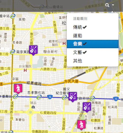 點選地圖頁的右上角,有個『放大鏡』的圖示,便可以開啓活動類型的條件選擇,現在把所有的活動分成五大類(傳統、運動、音樂、文藝、其他),民眾可以根據個人的喜好,來選擇一個以上的活動類型,用來過濾搜尋資訊。這邊與時間的限定條件是同時成立的,也就是說,搜尋的結果會建立在時間軸與活動分類這兩種條件限制上。