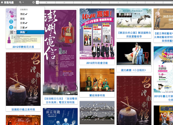 我們除了提供活動地圖的搜尋服務外,在地圖頁面中,點選網站左上方『活動牆』的連結就可以體驗不同的視覺化搜尋,所有的活動項目會散佈在「一面牆」上,此功能主要要來提供大量且醒目的活動資訊,在配合時間軸(在頁面上方)與活動分類(在頁面左上方)的設定條件,讓民眾可以在短時間快速的瀏覽所有的活動訊息。