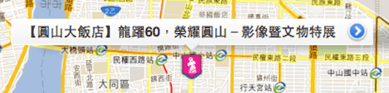 每個活動都會有自已的活動詳細頁面,記錄了活動較為細節的部分,為了讓地圖頁呈現方式簡潔,我們並不會在地圖上就直接顯示活動的所有內容,而是在地圖上僅對點選的活動地標,只有顯示活動內容的標題,點擊地圖上的活動標簽(下圖),才會進入活動詳細內容的分頁。