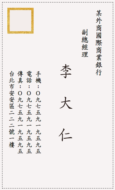 正面,是直式的,中間是你的名字三個字,右邊是公司名、頭銜(就是那個頭銜!)。
