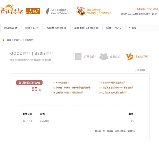 2. 百分百(100%)折抵 :Battle紅利點數(金幣)無折抵上限,舉例您目前有紅利點數1200點,您消費金額為1100元,即可全額折抵。這次訂單您無須付款,紅利點數使用後剩餘100點,除了抵扣商匹外還可以抵掉運費。