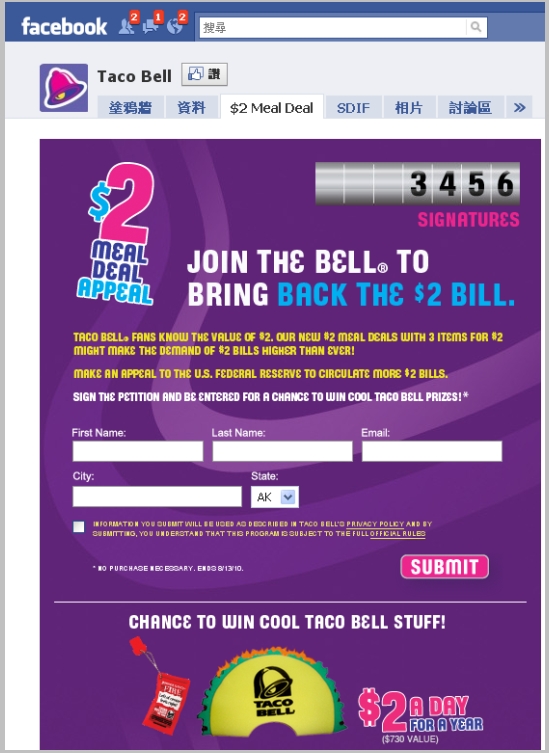 大約三年前美國Taco Bell曾做過一次有趣的網路行銷活動,專賣墨西哥風味的連鎖速食店Taco Bell,雖然是墨西哥風味,但這種速食店的定價就和麥當勞差不多,也是主食加餅乾再加飲料大概要3~4美元,他們做的這一場行銷活動,叫做連署要「2元美鈔」回來!