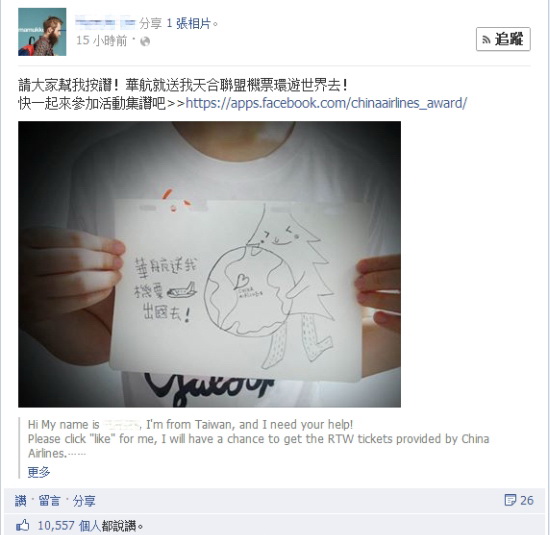 5. 第一位蒐集到1萬個讚的粉絲,並將照片轉分享於華航旅遊頻道粉絲頁,即可獲得【天合聯盟環球機票】
