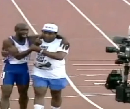 人生有一件事情比獎牌還重要:選手因腿傷痛苦倒地,這時候,一個陌生人闖進場中…..