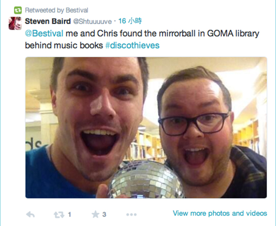 九月開始的英國Bestival音樂節,宣稱他們的Disco球被偷了。民眾只要照著Bestival事先給的提示,在英國不同城市找到預先藏好的Disco球,拍照上傳到Twitter或者Facebook並標籤#DiscoThieves就可以得到兩張免費的入場券。