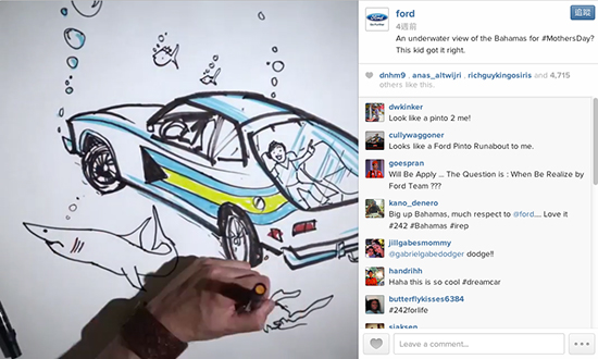 在母親節到來之前,Ford福特汽車在Instagram上傳了一系列搭配母親節的10秒微型影片。由不同的小朋友描述自己覺得母親夢想中的車,然後Ford的繪畫師動手開始將描述畫出來。天馬行空的童言童語造成網友大量分享討論。