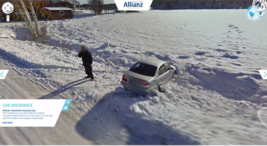 法國的安聯人壽Allianz為了解決保險商品型錄索取率低的問題,製作了「Real Life」互動網站,蒐集大量在Google街景地圖找到的“意外”,有一些是真的意外事故,有一些則是有趣的意外動作,要大家正視風險無所不在,包含朋友輕鬆一下的無厘頭,並在Facebook粉絲專頁分享,引發大量討論,高峰時幾乎每10秒就有一則分享,互動網站附上這些“意外”可投保的說明,也將圖片結合說明印製成型錄,吸引空前130倍的索取,讓更多人認識他們提供的服務。