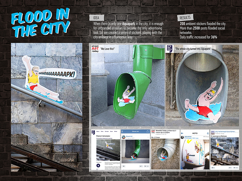 6 八月, 2014 Mr. 6 瞬間路上水管、扶手都變成滑水道,提醒民眾是時候到水上樂園消消暑了。俄羅斯水上樂園在街頭各個角落的水管或是扶手等,貼上小朋友在玩滑水道的示意貼紙,可愛吸睛的創意讓看到的民眾紛紛拍照網路分享,水上樂園也因此增加36%來客量。 俄羅斯葉卡捷琳堡的水上公園Aquapark Limpopo為了吸引更多遊客,將城市街道上許多水管、扶手等,貼上玩水小朋友在上面玩滑水道的貼紙示意,再一般不過的城市角落都因此變成了水上樂園,提醒民眾是時候到水上樂園消消暑了Aquapark Limpopo的創意游擊行銷手法吸引2500多人在社群網站上分享圖片,也幫助水上樂園增加36%的來客量。 圖片來源