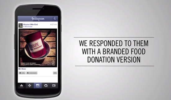 加拿大蒙特利爾的慈善組織Mile End Community Mission為了募捐罐頭,利用人們在Instagram、Facebook上傳美食照片的習慣,將網路上常見的各類美食分享,製作成“罐頭版”拍照,只要有人上傳美食,慈善組織就會回覆“分享你所吃的食物”並附上該類型的示意罐頭照片,來鼓勵大家捐贈罐頭給需要的人。