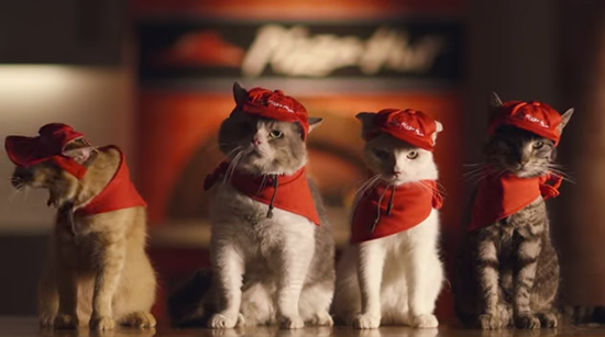最近日本的Pizza Hut結合網路上最受歡迎的動物-貓咪推出了獨一無二的貓咪版的Pizza Hut網路虛構店。只要上活動網站,就能看到許多貓咪員工在Pizza Hut工作的一系列影片,不論是接店裡電話,做財務報表和掃地等都難不倒他們。Pizza Hut用貓咪版在網路上造成大量分享討論,搭配宣傳期間的特別優惠,同時增加品牌曝光度和銷售量。