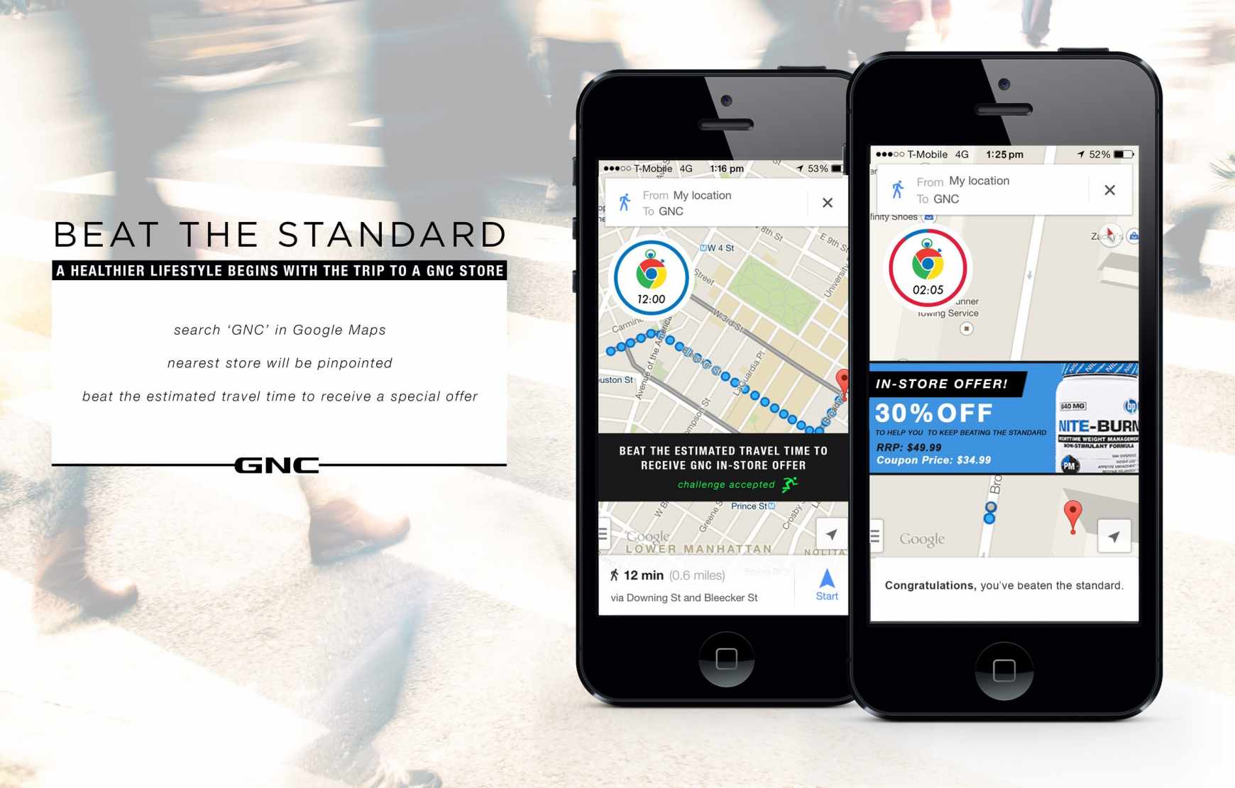 保健食品連鎖專賣店GNC和Google Map合作,只要在手機打開Google Map輸入GNC,就會在地圖上顯示步行到最近的GNC分店的路線和預估平均到達時間並開始倒數,只要是在時間內到店,就可以享有7折優惠,傳達GNC廣告主打”Beat Average"(超越平均/庸)系列廣告訊息。