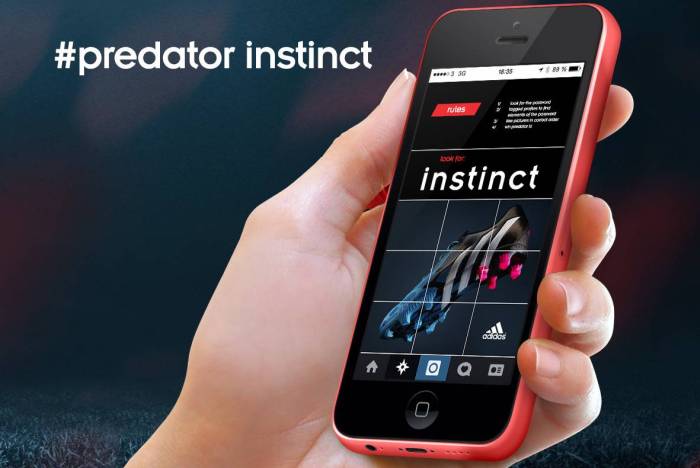 2 九月, 2014 Mr. 6 相片社群網站Instagram出現了史上第一個互動遊戲?波蘭的愛迪達(Adidas)推出了找密碼拿獎金活動。 最近在波蘭的愛迪達為了宣傳最新足球鞋「Predator Instinct」在官方Instagram帳號推出了一個尋覓碼活動, 參加者要先到波蘭愛迪達的官網,在分成9項的Predator Instinct照片上找出4張有tag的,然後點了這些TAG之後會有顯示密碼,你必須要找出4個密碼並正確的依順序輸入,每天第一位成功解讀密碼順序的參加者,就會獲得200元美金。