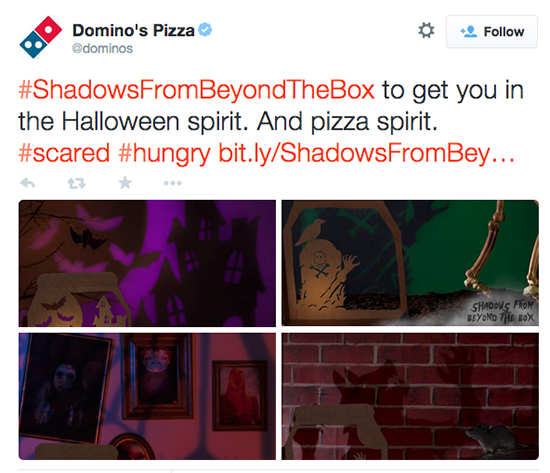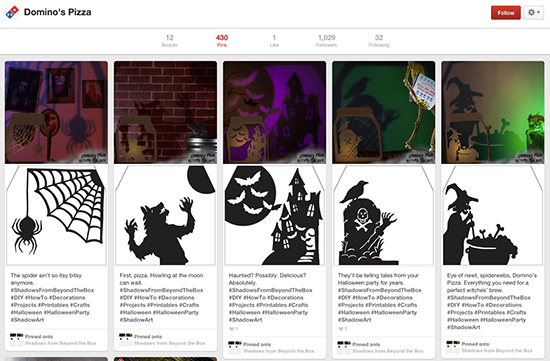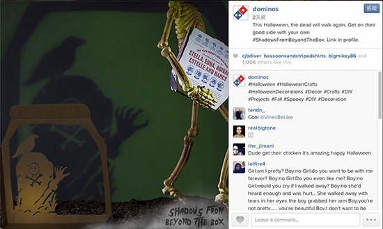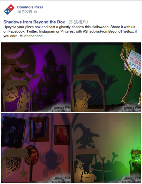 30 十月, 2014 Mr. 6 吃完Pizza的盒子別丟掉!可再變成萬聖節鬼影應景裝飾。Domino’s Pizza達美樂搭上萬聖節做全面的社群行銷在官方的Facebook、Twitter、Instagram、Pinterest放上圖示,只要印出圖形,並依樣在Pizza盒剪出形狀,就可為家裡增添萬聖節氣氛,當然,前提是一定要先叫Pizza來吃 吃完Pizza的盒子別丟掉!可再變成萬聖節鬼影應景裝飾。Domino’s Pizza達美樂搭上萬聖節做全面的社群行銷在官方的Facebook、Twitter、Instagram、Pinterest放上圖示,只要印出圖形,並依樣在Pizza盒剪出形狀,就可為家裡增添萬聖節氣氛,當然,前提是一定要先叫Pizza來吃。
