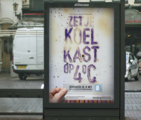 每天有2000位荷蘭人食物中毒,冰箱沒設4℃是關鍵之一。為了宣導正確廚房處理、保存食物觀念,政府單位請生物學家讓廚房看不見的病菌現形並當作墨水用,來寫出宣導文字,噁心的病菌組成的字,吸引路人駐足觀看,達到宣導效果。