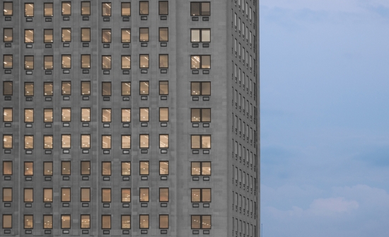 我們一看,眼前那棟商業大樓非常龐大,這時候,大部份的辦公室都已熄燈,黑壓壓一片,只剩樓梯間,因為是透明的,整排從1樓到17樓,發出一排光,看得很清楚。