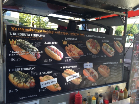 一個大熱狗,裡面是章魚燒的醬料和toppings(像柴魚、海苔那些)。這個叫做:「Japadog」,意思是日本食物,加上熱狗。
