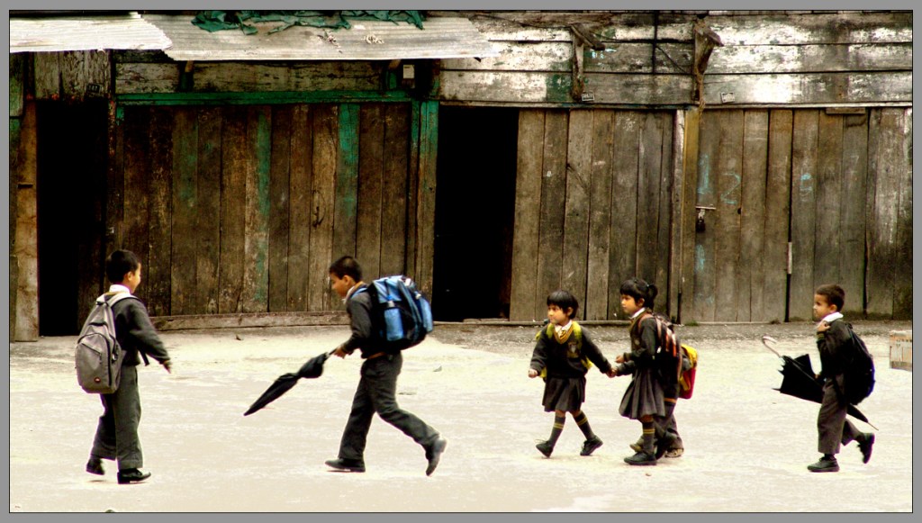 上學時間,路上都是穿著制服、運動服的小朋友,背著書包,走向學校。