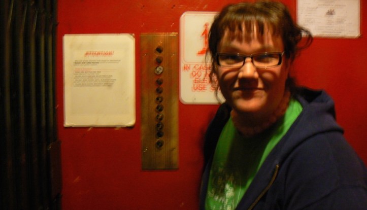 她敘述剛剛發生什麼事──她走進左邊的電梯,門關,電梯不走。任她怎麼按,都不走,就這樣停在十樓。她大叫、大聲求救,也沒人聽到,因為她遠在十樓。