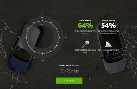 哪一台車最吸睛?最吸引你的注意?ŠKODA汽車製作“眼球”互動式行銷網站,來宣傳他們新推出的汽車,只要網友進入網站後,打開視訊做眼球移動測試,然後就會看一段由兩台不同顏色的ŠKODA汽車為主角的影片,並紀錄眼球關注結果,和所有來訪者比較,話題性十足
