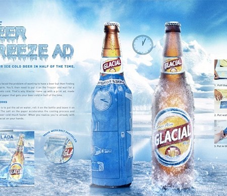 冰的啤酒最好喝!把速冰啤酒的秘密武器夾在雜誌內,引起啤酒消費者的注意。在巴西,Glacial啤酒在雜誌內頁廣告上,要大家將這一頁撕下加水後,包覆在啤酒上放到冷凍庫,即可加倍冰啤酒的速度,快速藏到好喝的冰啤酒。而原理則是在廣告內頁上加鹽