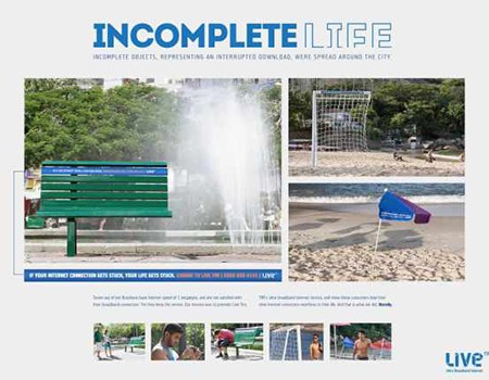 在巴西聖保羅的許多地方忽然出現只有一半的設施,例如半個遮陽傘、半個椅子等,吸引路人駐足拍照。這一系列由巴西網路電信公司TIM所安排放置設施,主要是廣告,選擇TIM的服務,才不會遇到下載到一半的窘境,成功吸引路人目光