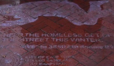 在寒冷的冬天,每當露宿街頭的遊民遇到下雨天,日子就更難過了。南非開普敦市政府,特別在道路上製作下雨天才會浮現的廣告,鼓勵民眾發揮同理心,捐款幫遊民度過寒冬,用防水漆將捐款訊息噴在道路上,依訊息指示傳簡訊就可以完成捐款