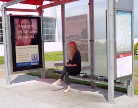 自拍上傳並標籤品牌口號,就會馬上變成品牌代言人出現在公車站。巧克力品牌Scharffen Berger結合公車站版位和相片社群Instagram做擬實體互動行銷,只要在等公車時自拍上傳並標籤品牌口號,自拍照就會即時出現在公車站廣告看板上
