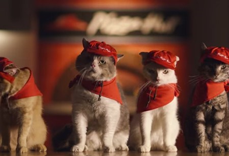 日本Pizza Hut推出貓咪版,可愛破錶的貓咪在一系列的影片之中不論是接電話、掃地、做財務報表等的萌樣,讓人忍不住分享,瞬間成為網路話題,並搭配優惠宣傳,增加品牌曝光度和銷售量
